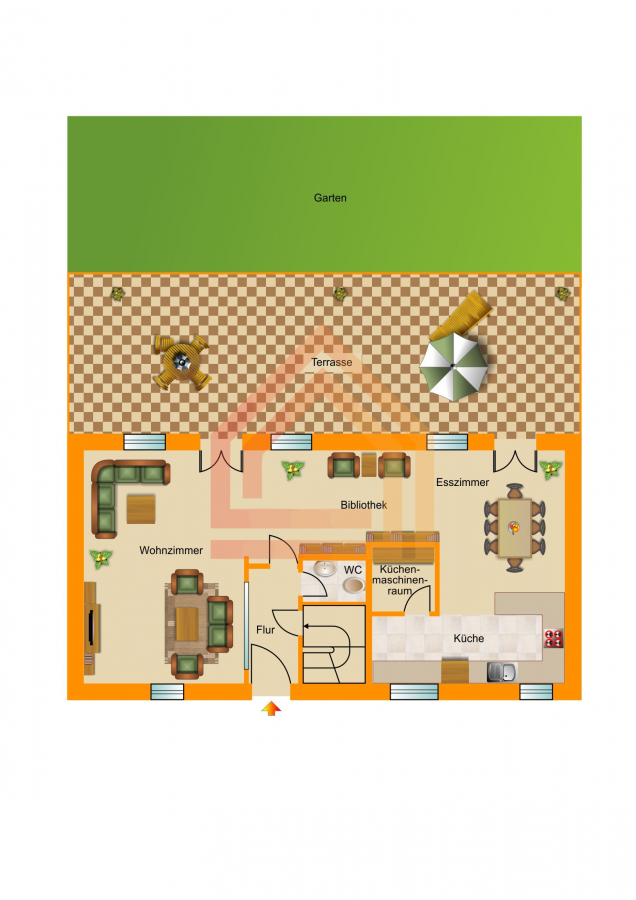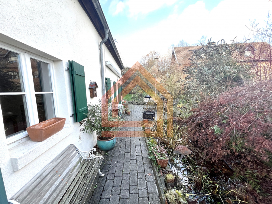 Die private Terrasse mit Garten und kleinem Teich schafft einen Ort, an dem man entspannt den Blick ins Grüne schweifen lassen kann.